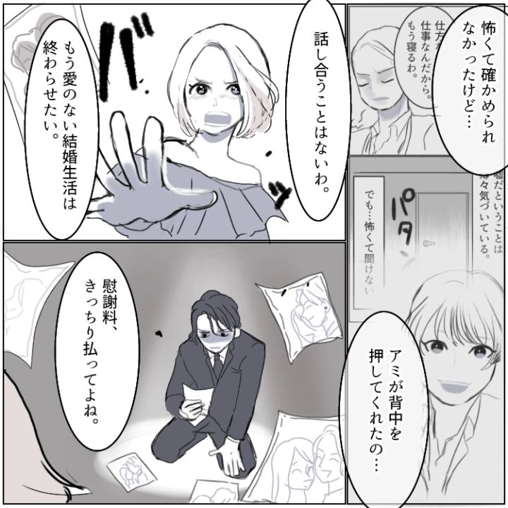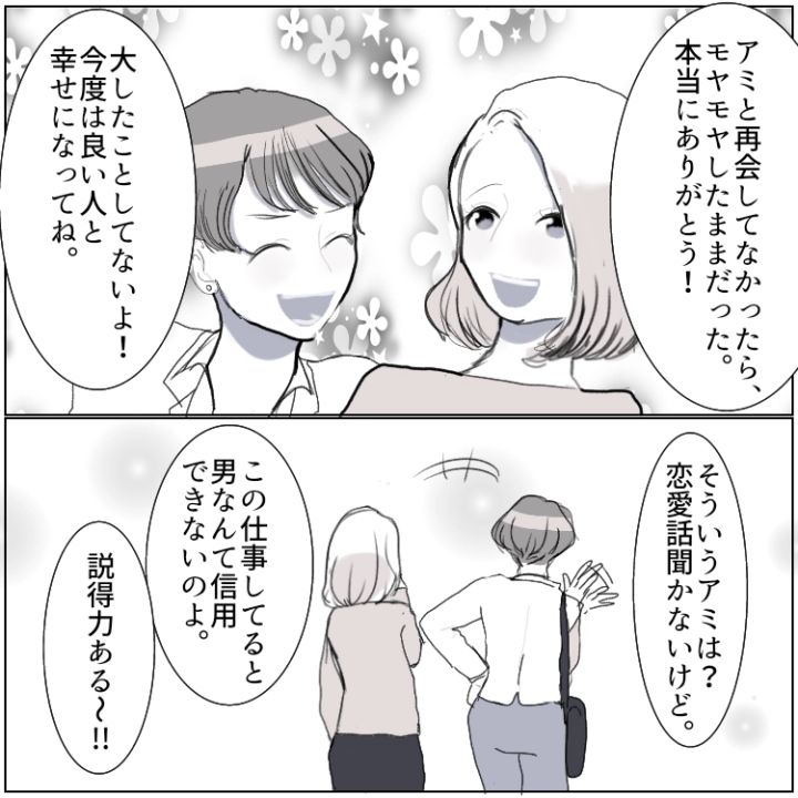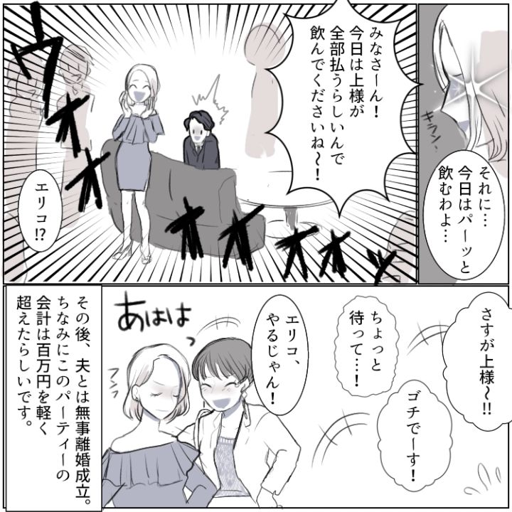 アミと結託して、無事にクズ夫を懲らしめることができたエリコ。これからは夫のことは忘れて、幸せに過ごしてくださいね!