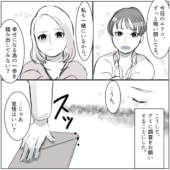 そんなある日、偶然高校の同級生・アミと再会する。彼女が不倫専門の芸能記者をやっていると聞いて、夫のことを相談するエリコ。すると、なんとアミが夫の不倫調査をしてくれることになる。
