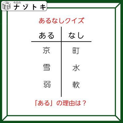 2. あるなしクイズです!「京にあって町にない、雪にあって水にない」あるの共通点は?【難易度LV3.・中辛】