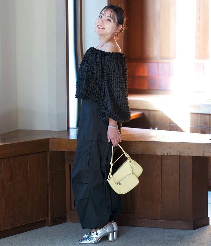 黒を女っぽく見せる鍵は、質感と肌の温度差をひとさじ。ニットのぬくもりにひんやりしたツヤ。強い黒に肩から覗く肌の抜け感。そのギャップが重なるほど、黒は柔らかな印象になり、嫌味のない女っぽさが生まれ、装いに大人の余裕が漂います。