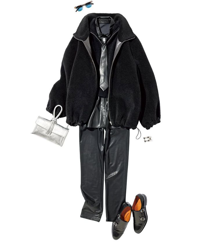 リバーシブルボアジャケット¥39,600レギンス¥12,100(ともにELENDEEK)ニットベスト¥23,100(アルページュストーリーオリジナル)タイ付きシャツ¥18,920(メゾンスペシャル/メゾンスペシャル 青山店)バッグ¥38,500(リンレザー)シューズ¥39,600(ジャランスリウァヤ/ジャランスリウァヤ 日本橋)サングラス¥47,300(アイヴァン/アイヴァン 東京ギャラリー)バングル¥4,400(アビステ)