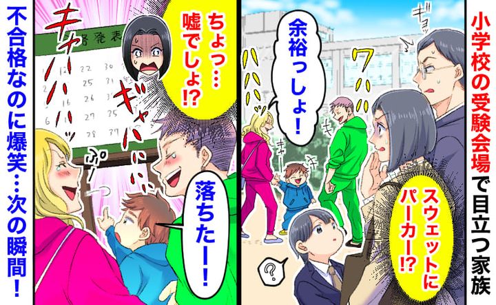 3. 「スウェットにパーカー!?」小学校受験で目立つ家族。合格発表当日、不合格なのに爆笑…次の瞬間!
