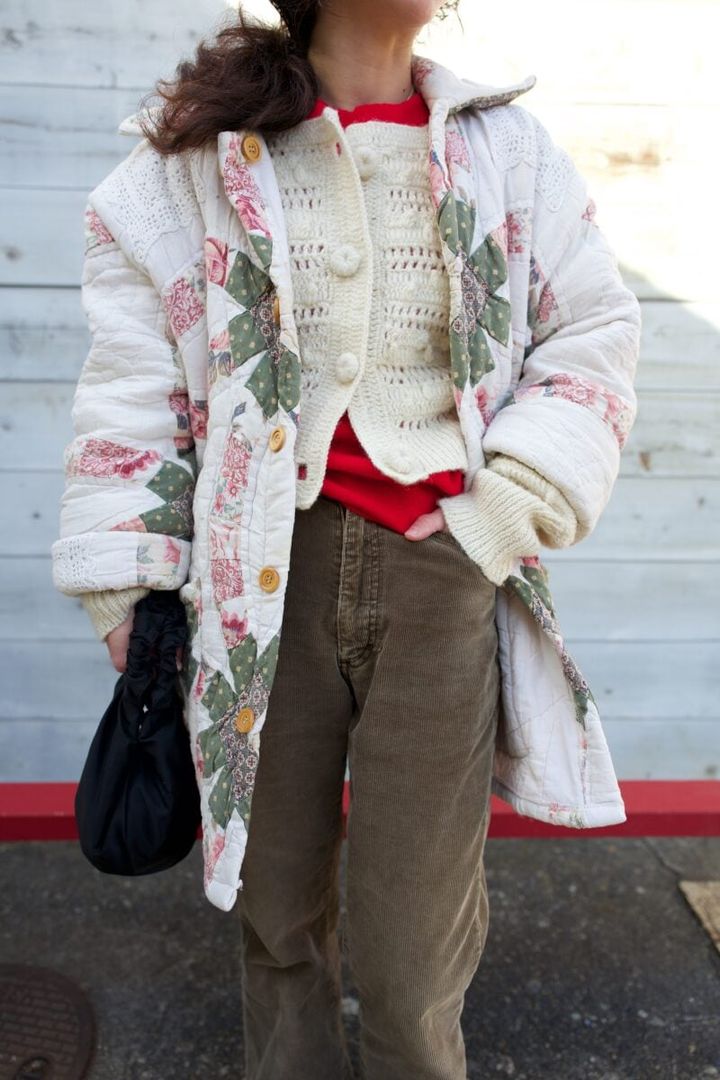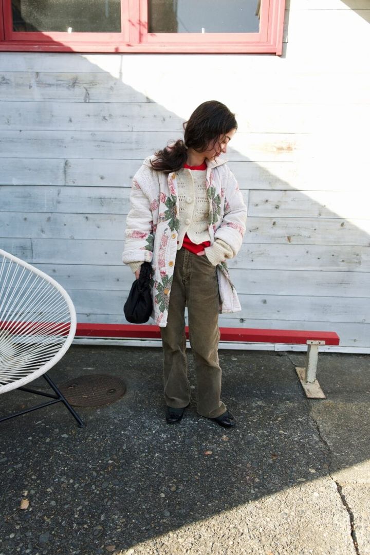 「柄が可愛いキルティングジャケットは、フラワープリントをつなぎあわせたパッチワークデザインにひとめぼれ♡ インの洋服は、赤ニットとPURの白カーデでメリハリをつけました。コーデュロイのカーキパンツや黒のバレエシューズで、少し重厚感を出して全体のバランスを取っています」(PURデザイナー・八木下泉さん)