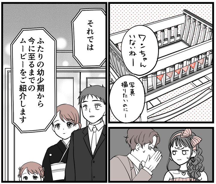 司会者の合図で、幼少期から現在までを振り返るムービーが流れました。最後に「大切な家族のミカン」と紹介され、チワワのミカンの映像が映し出されると、新郎新婦は思わず驚きの表情を見せました。