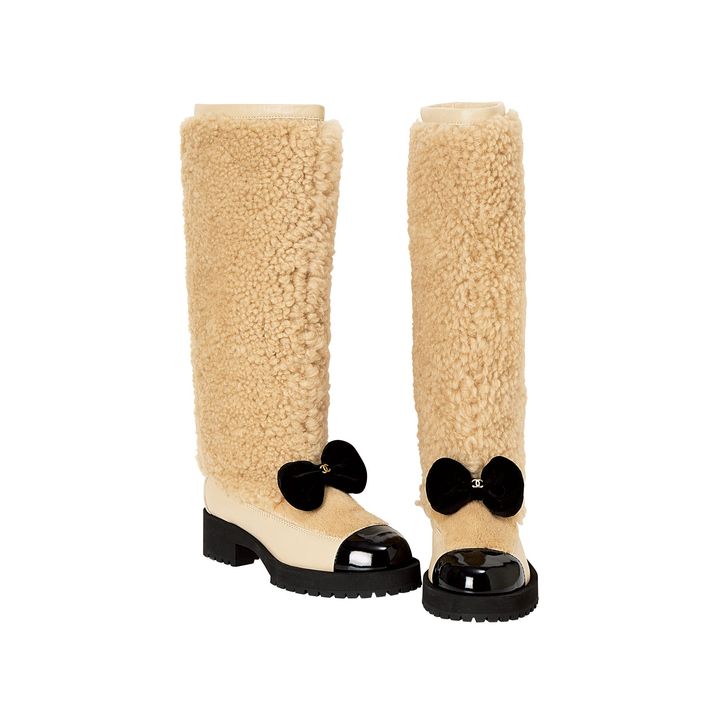 メゾンが誇るシープスキンのブーツは、ツートンの厚底パンプスとブーツが合体したようなデザイン。ダブルCをあしらったベルベットのリボンが、甘い華やぎを添えて。