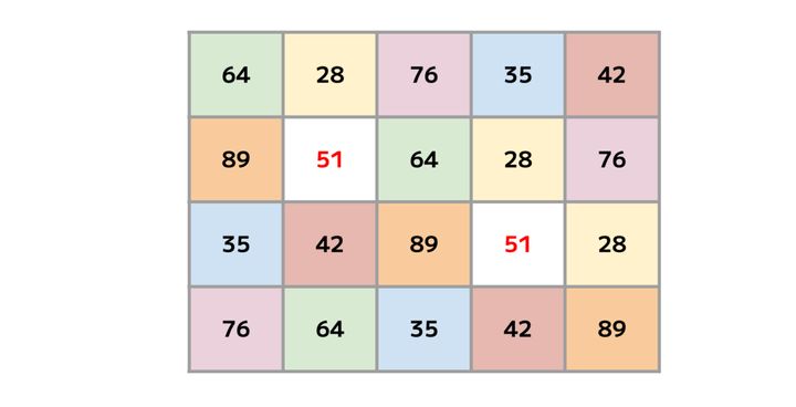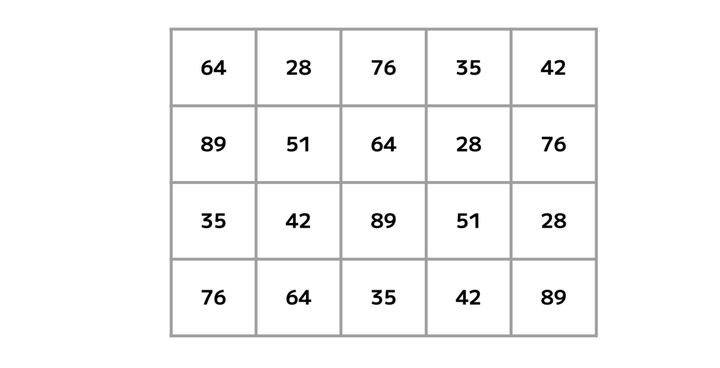 【脳トレ】5×4の表に書かれた7種の数字「28・35・42・51・64・76・89」。1種だけ2つしかない!?その数字はどれだ??