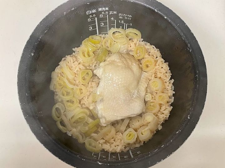 2. その上に、長ねぎ、鶏肉を置いて普通炊きする(あれば炊き込みご飯モードで炊いてください)。