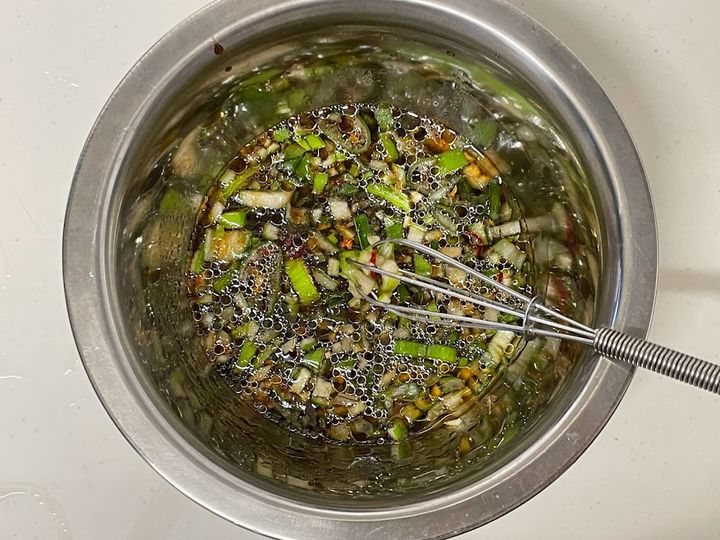 仕上げの香味だれは、ねぎの辛味はなく、ピリッと効いた唐辛子とみじん切りのしょうががアクセント。さっぱりとしていて、全体の味をきゅっと引き締めてくれます。唐辛子としょうがを抜けばクセもなくなるので、子どもでも食べやすいと感じました。