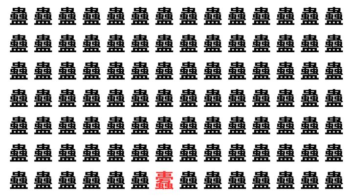 たくさんの「蠱」の中に、よく似た別の漢字が1文字だけ隠れています。