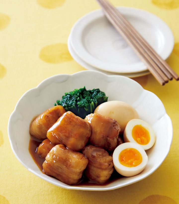 ヘルシー食材の高野豆腐が〈満足おかず〉に変身! 少量の豚バラ肉を巻いて甘辛く煮れば、ゴロっと感のある〈角煮風〉に。