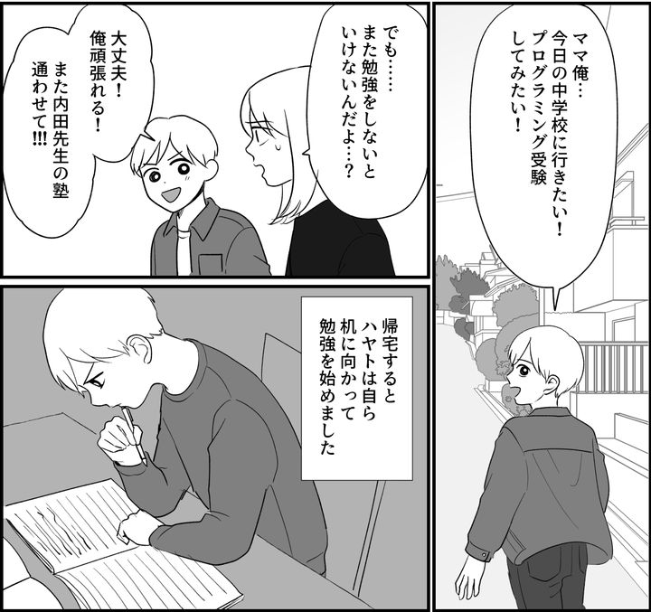 私(アイ)は夫のマサヒロと、2人の息子ハヤトとダイチの4人家族です。私たちはハヤトが希望するA中学に入れるように、家族総出で必死のサポートを始めました。しかし私たちの気持ちをよそに、ハヤトは裏切り続けます。警察沙汰になったり、夫の財布からお金を盗んだり。ハヤトはどんどん私たちの知らないハヤトになっていってしまったのでした。けれど、それに至ってしまったのはハヤトのせいでも受験のせいでもなく、ハヤトに過剰な「期待」をかけ続けた私たちのせいだったのでした。そうして私たちは中学受験から撤退することに決めたのでした。プログラミング専用のPCを買い、今は好きなことを存分にして過ごしてほしい……そう思いながら夏休みを終え、二学期に入ったとき。以前通っていた塾の内田先生から、プログラミング受験の話を聞くことになるのでした。