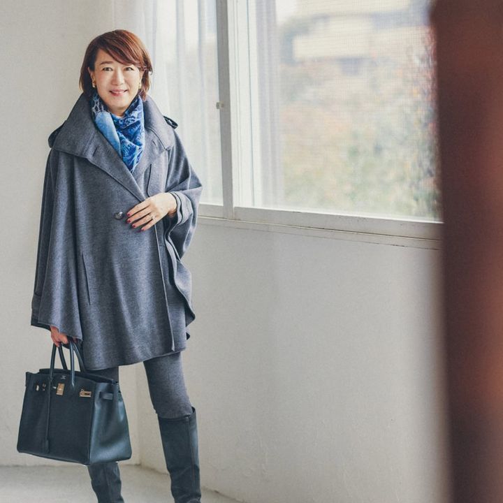 「いつもバッグや靴まで全身のバランスを必ず確認して、基本色でまとめています。今日はマントをメインにしたかったので、ボトムスはスリムにしてバランスを取りました。最近は素材や着心地がいいものを選ぶようになって、衝動買いがなくなり、クローゼットは厳選した好きなものだけに」