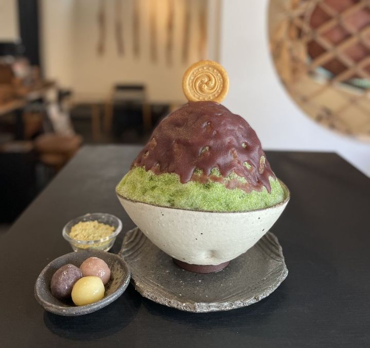 5月中旬〜9月に提供するかき氷に注目。写真は大和大納言あずきのこし餡シロップ、茶人だった秀長さんにちなむ抹茶シロップをかけ、郡山城の瓦モチーフのクッキーをトップにした、見た目も可愛い一品です。