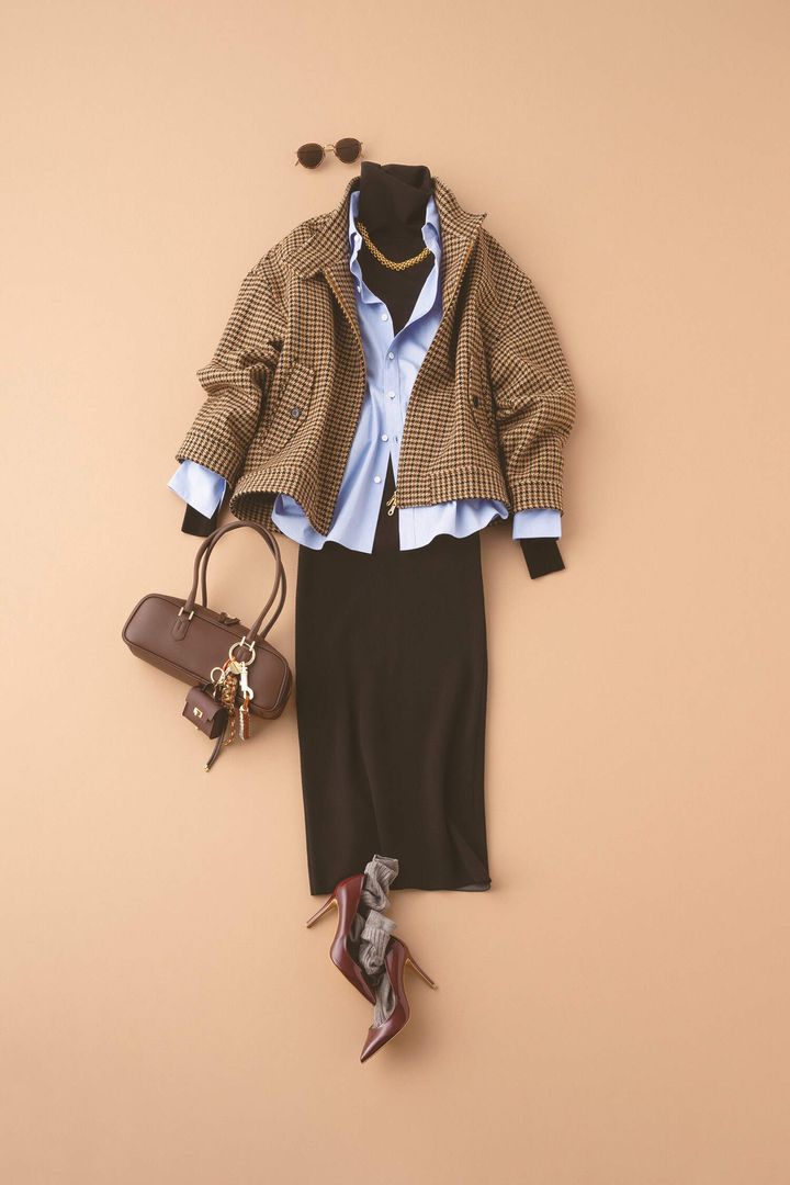スカート¥27,500(カオス/カオス丸の内)ブルゾン¥49,500(ソフィット/ソフィット新宿店)シャツ¥49,500(オブリオ)ニット¥34,100(スローン/ザ ショップ スローン新静岡セノバ店)チャーム¥10,890〈ヴィアメイルバッグ〉バッグ¥39,600(ともにアルアバイル)靴¥18,150(ダイアナ/ダイアナ 銀座本店)ネックレス¥25,300(メラキ/オブリオ)サングラス¥67,100(アイヴァン 7285/アイヴァン 7285 トウキョウ)ソックス¥3,630(パンセレラ/真下商事)