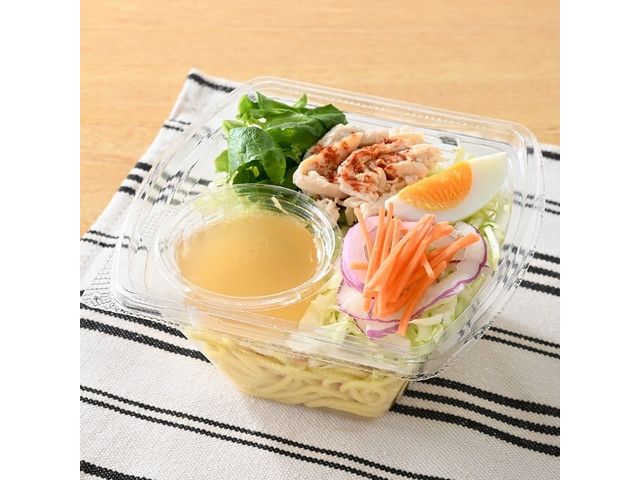 中華麺と蒸し鶏、野菜を使用したさっぱりとしたラーメンサラダです。ゆず果汁に鶏だしやかつお昆布だしを合わせたゆず塩ドレッシング付きです。 ※宮崎県、鹿児島県では取り扱いがございません。