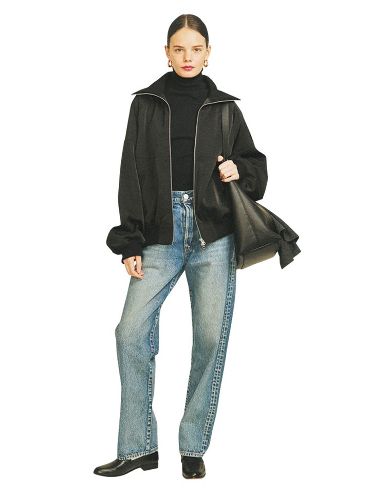 【POINT】無骨なデニムと波長の合うスポーティなテイストをクールに装えるブルゾンで投入。なかでも力の抜けた曲線フォルムは、気張らない洒脱さが加わる。