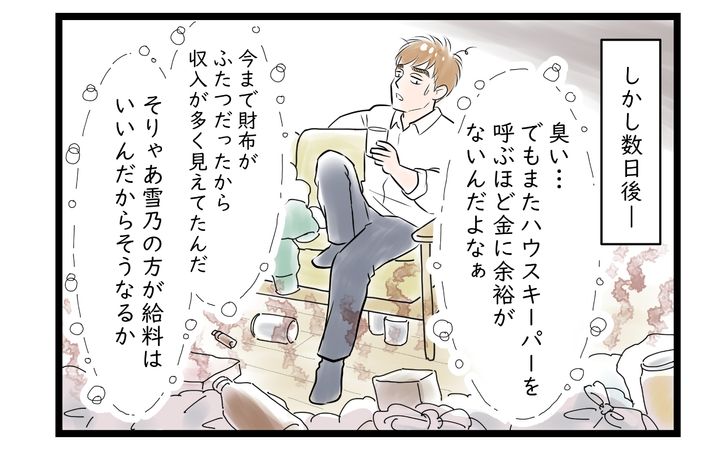 妻に怒られる日常からは解放されましたが、仕事から家に帰ってきても家事をせずダラダラと過ごしているとすぐに部屋は荒れていきました。部屋の掃除、食事の買い出しや料理に片付け、洗濯、ゴミ出し、風呂やトイレの掃除、出したものは元あった場所に戻す……妻がいなくなってから、家事とはこんなに種類があったのかと思い知ることになりました。