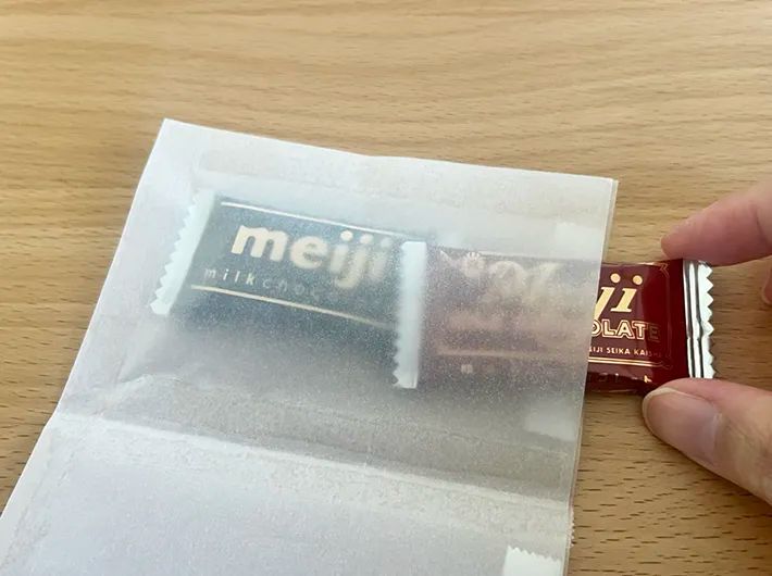 本記事で紹介したように、A4サイズのトレーシングペーパーを8等分に折って作れば、小さめのチョコレートを2個入れるのにぴったり。