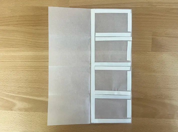 トレーシングペーパーの片側半分に、折り目に沿って両面テープを貼ってください。