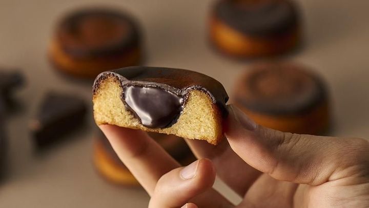 これに生クリームを合わせたなめらかなガナッシュを「塩バニラフィナンシェ」にたっぷりいれて、さらに上からショコラでコーティングしました。