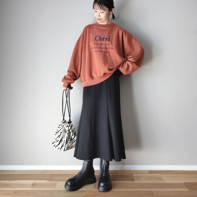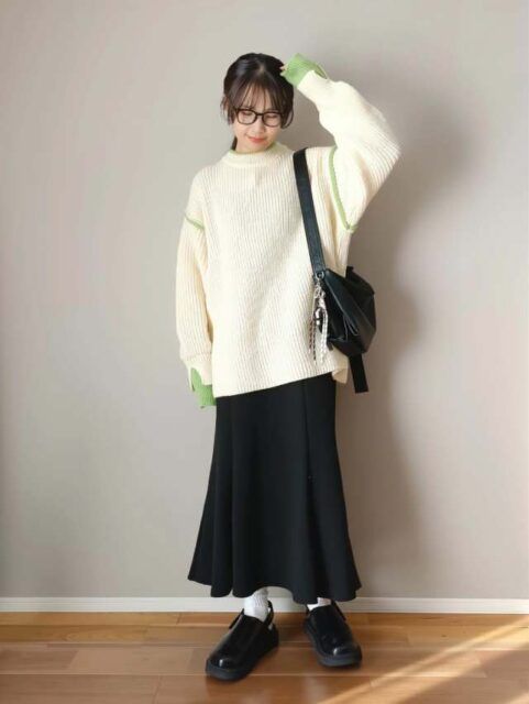 黒のロングマーメイドスカート×ゆったりニットのコーデ