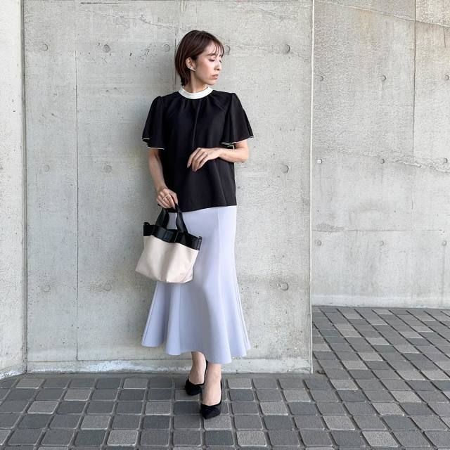 きれいめ服の王道・マーメイドスカートは通勤コーデにうってつけ。ジャケットを羽織ったりブラウスを裾出ししたりすると、ボディラインがさりげなく隠れる上にコーデの甘さを解消。これなら、きれいめに着こなしても時代遅れ感はありませんよ。