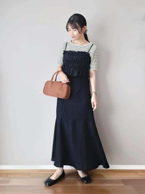 マーメイドスカートが時代遅れに見える理由は二つ。1点目は「短い丈感」です。いまスカート丈の主流はロング。そのためマーメイドスカートもひざ下~ミモレ丈くらいの丈ではなく、ロング丈で取り入れるのがコツです。