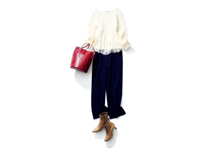 レースキャミソール付きチュニック¥23,100/アプワイザー・リッシェ ラップパンツ¥12,000/PLST ショルダーバッグ¥6,490/カシュカシュ(アンビリオン) ショートブーツ¥31,900/ダイアナ(ダイアナ 銀座本店)