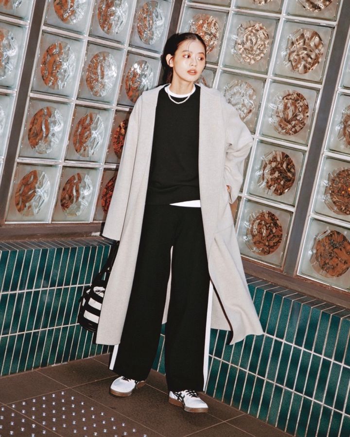 コート¥77,000(ノーブル/ノーブル 有楽町マルイ店)スウェット¥30,800(ハイク/ボウルズ)中に着たTシャツ¥1,870(ヘインズ/ヘインズジャパン カスタマーセンター)パンツ¥22,000(ルーニィ)バッグ¥42,900〈ORSETTO〉リング¥35,200〈ピモンテ〉(ともにピモンテ)靴¥14,300(オニツカタイガー/オニツカタイガージャパン)ネックレス¥157,000(GIGI/ホワイトオフィス)パールイヤカフ〈右耳〉¥68,200ダイヤイヤカフ〈左耳〉¥90,200(ともにヒロタカ/ヒロタカ 表参道ヒルズ)