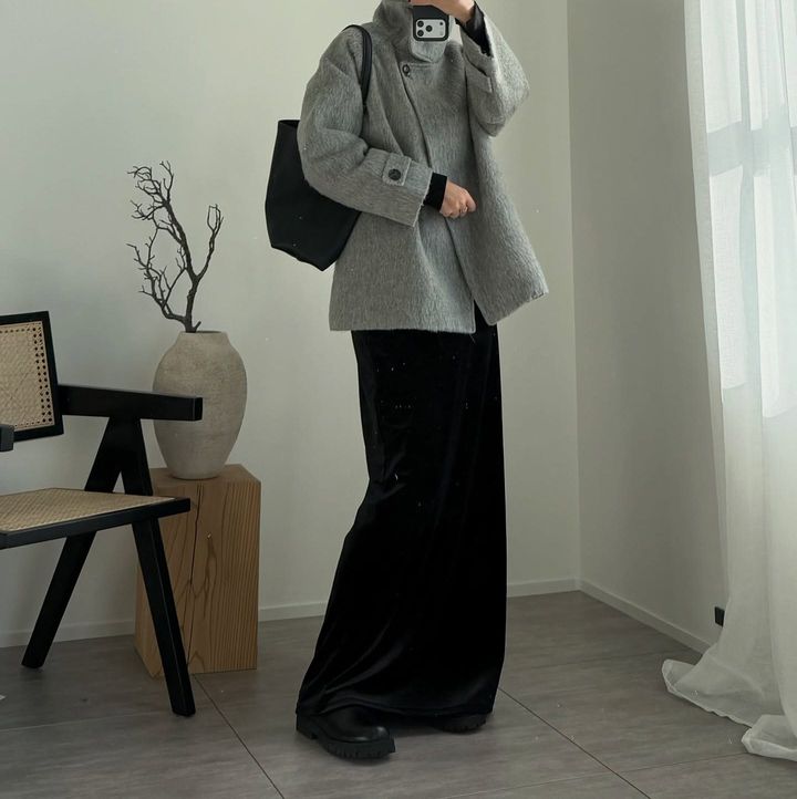 重たくなりがちな冬コーディネートも、明るいグレーを羽織ることで軽やかさが加わり、洗練された雰囲気に仕上がります。足元にはボリュームのあるブーツを合わせて、今っぽい重厚感をプラスするのが正解。