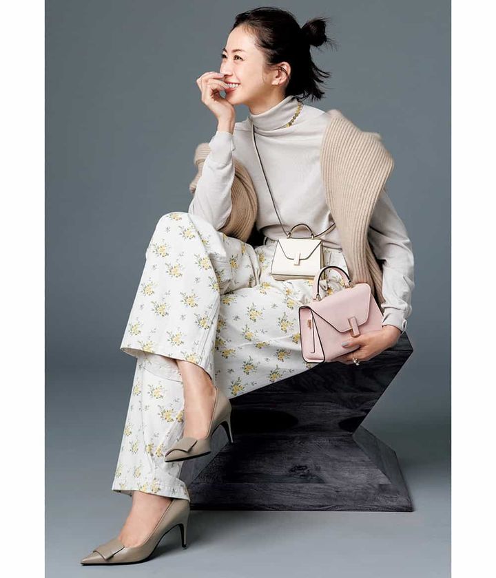 バッグ「マイクロ イジィデ」〈H14×W19.5×D9.5㎝〉「イジィデ ベルト」〈H9×W12×D6㎝〉(ともにヴァレクストラ ジャパン)ニット¥31,900(エブール/リトルリーグ インク)肩にかけたニット¥77,000(キャッシュアンドバルバ/エグジステンス)パンツ¥48,400(THE NEW SOCIE