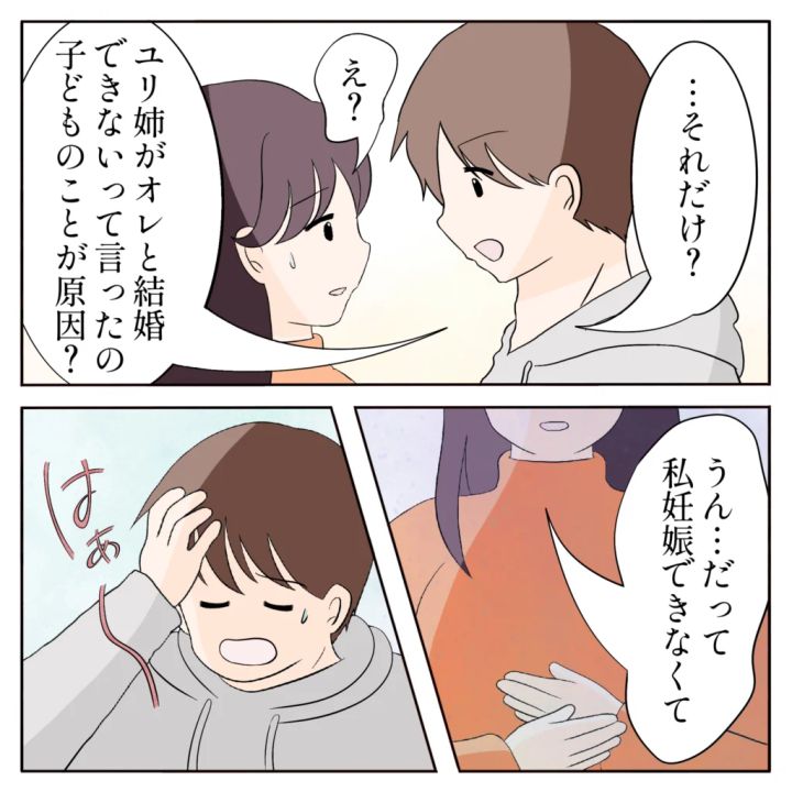 「・・・それだけ?ユリ姉が俺と結婚できないって言ったの、子どものことが原因?」そう尋ねると、ユリ姉は深刻そうな表情で「うん、だって私妊娠できなくて」と小さくつぶやきました。その言葉を聞いた瞬間、俺は思わず安堵のため息をつきました。