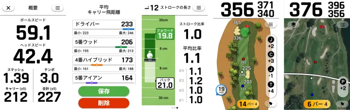 〈左から〉スイング計測、クラブマッピング、パッティングトレーニング、ゴルフナビ、航空写真表示の画面