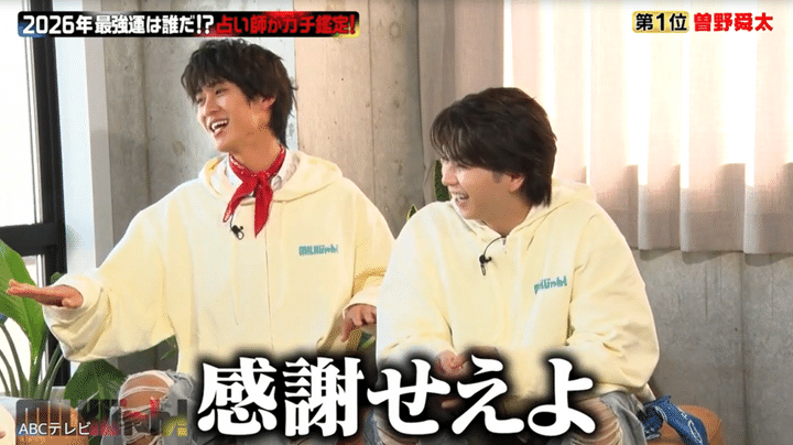 イヴルルド氏によると曽野には、「去年の11月から24年に一度の大大大大大運命の予告がスタートしております」とのこと。この鑑定に曽野は、「すごい忙しくなって、ありがたいことに夢だってどんどん紅白とか、自分のやりたいことが叶うようになってきた」と納得。「(今年は)さらにそれが叶う年!」とイヴルルド氏が明かすと、曽野は大喜びし、他のメンバーも「じゃあ紅白お前のおかげやん!」と盛り上がった。