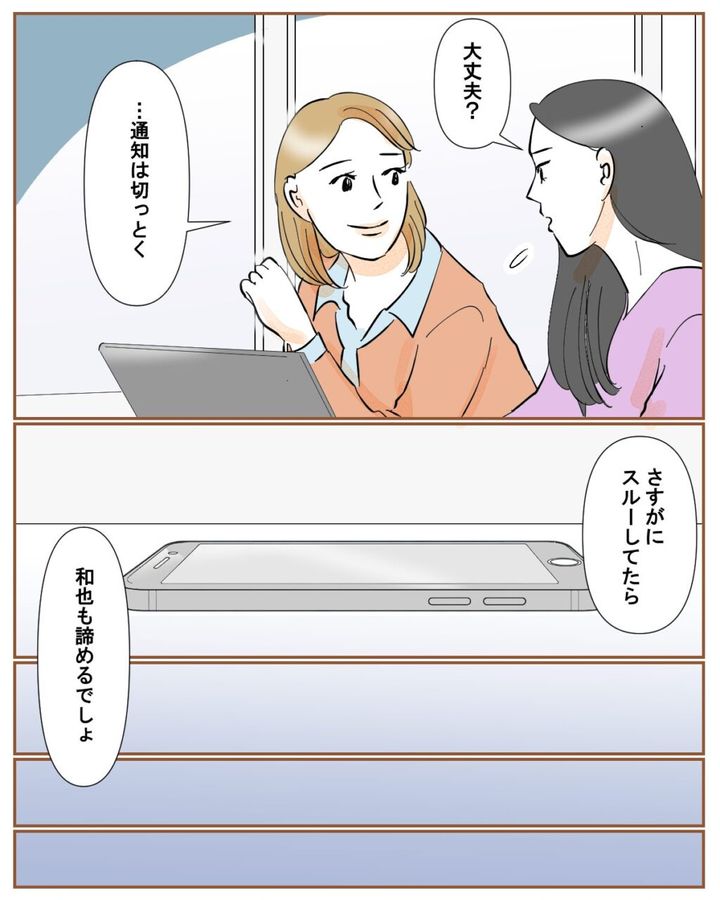 麗子は心配そうな表情で「大丈夫?」と声をかけてきました。私は小さく笑って、「・・・通知は切っとく」と答えます。さすがにスルーし続ければ、和也もいずれ諦めて、メッセージを送ってこなくなるはずです。