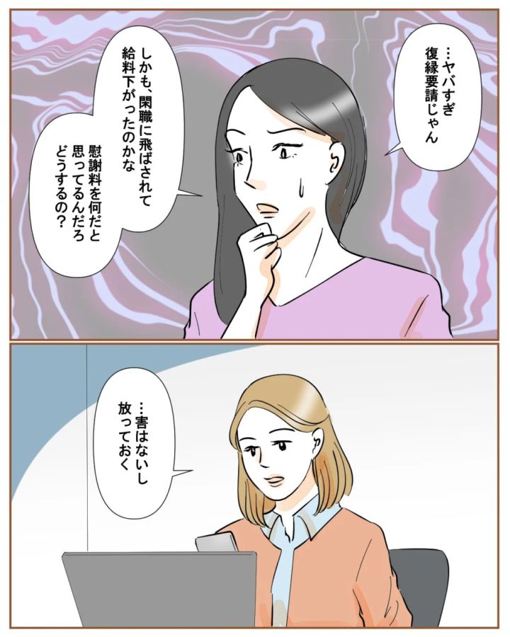 和也のメッセージを読んだ麗子は、引き気味に「ヤバすぎ、復縁要請じゃん」とつぶやきます。そして「しかも閑職に飛ばされて給料下がったのかな?慰謝料を何だと思ってるんだろ、どうするの?」と心配そうに聞いてきました。正直、もう和也とは関わりたくありません。触らぬ神に祟りなしということで、このまま放っておくことにしました。