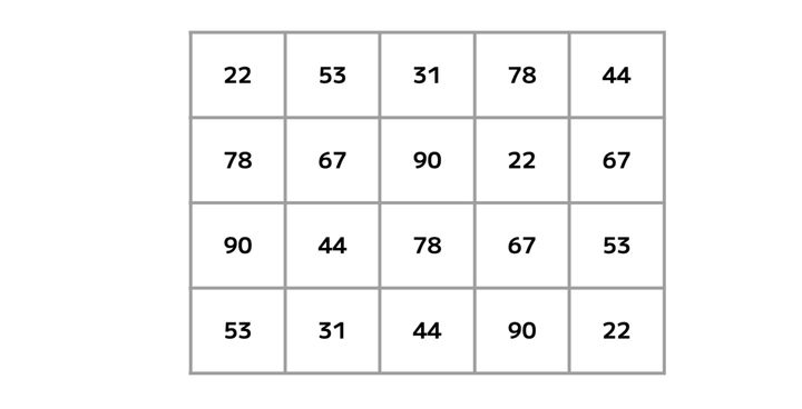 画像の表は横5マス、縦4マス。 そこに「22・31・44・53・67・78・90」という7種の数字が配置されています。