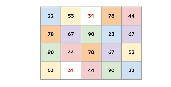 3. 【脳トレ】5×4の表に書かれた7種の数字「22・31・44・53・67・78・90」。1種だけ2つしかない!?その数字はどれだ??