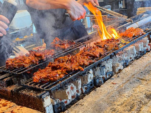 入ってすぐにワクワクするのが、焼き台で焼かれている様子! 職人さんが焼き鳥や鶏もも一枚肉を焼き上げたり、たれに漬ける様子が見られ、気持ちが高まります。