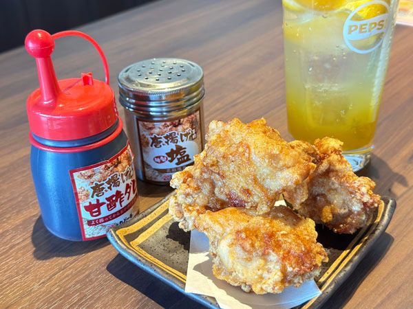 ・もも唐揚げ(並盛4個 550円) からりと揚げられた唐揚げは、噛むと肉汁たっぷり! 特製塩をかけたり、甘酢ダレをつけたりして、味の変化も楽しめます。