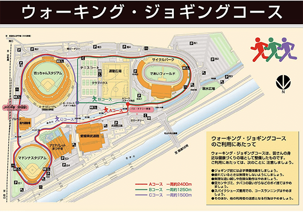 Aコース:1周約2400m Bコース:1周約1250m Cコース:1周約1500m ウォーキングをしていると、ジョギングの方々も見かけます。