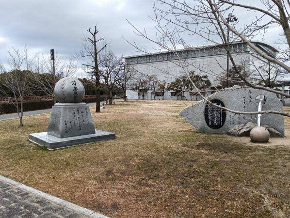 愛媛は野球を愛した俳人正岡子規の出身地でもあります。 野球ボールなどの石碑が坊っちゃんスタジアム正面の芝生にあります。 坊っちゃんスタジアム近辺には地元選手だった方々の手形などもあるので、ウォーキングしながら見たり しています。