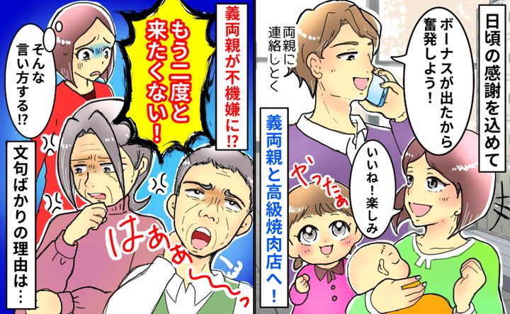 夫にボーナスが出たということで、日頃お世話になっている義両親を誘って焼肉に行くことになりました。しかし、入店するなりお店の対応にモヤモヤしてしまうことに……。ですが、最終的には義両親の振る舞いのほうに、強い苛立ちを感じる状況となってしまったのです。