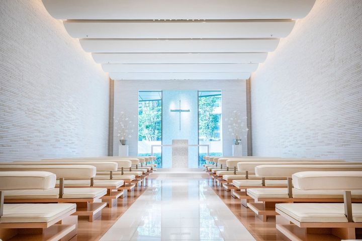 チャペルは水中に雪が降り積もるような、神秘の世界をイメージしてデザインされています。壁一面にはギリシャの白大理石タソスホワイトを、祭壇には真珠貝をあしらったピュアホワイトの空間が神聖で愛に満ちた誓いのひとときを彩ります。