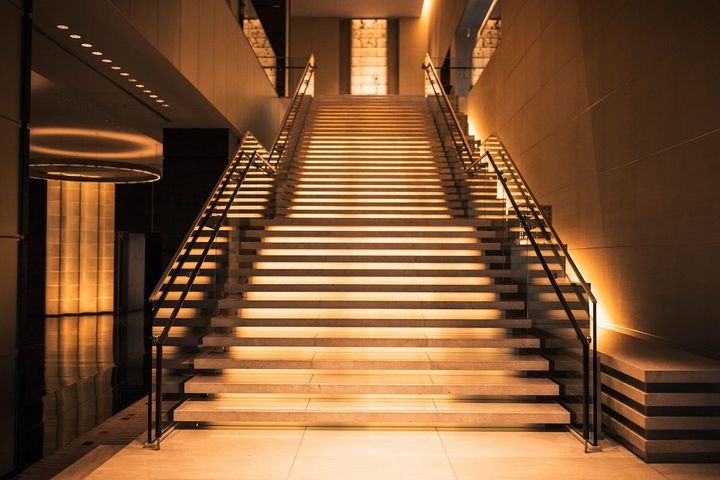 無機質なデザインのシェードから自然光が差し込み、どこか幻想的なムードを感じさせるエントランスフロア。こちらも人気のフォトスポットとなっています。