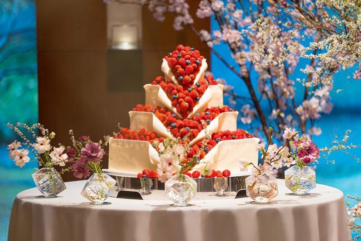披露宴会場に華を添えるウエディング・ケーキは、もちろんテーラーメイドスタイルでオーダー可能です。写真はその一例で、ベリーがこぼれるような遊び心のあるデザイン。