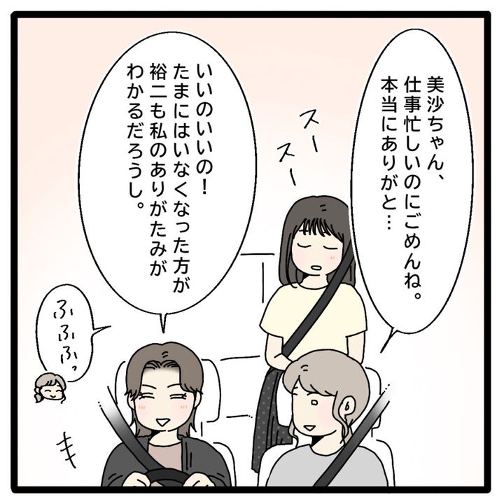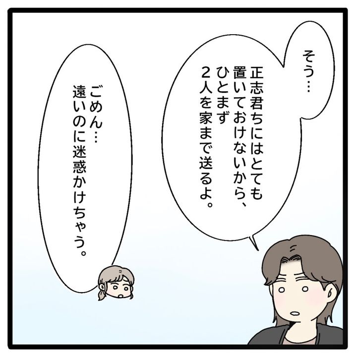 私を心配した美沙ちゃんが「そう・・。正志君ちにはとても置いておけないから、ひとまず2人を家まで送るよ」と言ってくれ、申し訳ないと思いつつも義実家へ戻る気にはなれず、自宅まで送ってもらうことにしました。