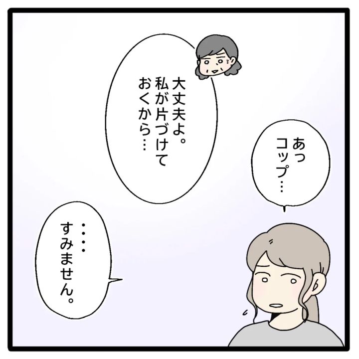 私が「あっ、コップ・・」と言って片付けようとすると、義母が「大丈夫よ。私が片付けておくから・・」と優しく言ってくれたので、義母の好意に甘えることにしました。