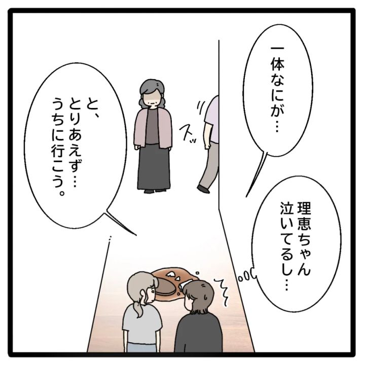 廊下には、さっき私が落として割ってしまったコップがそのままの状態。異様な状況を察した美沙ちゃんは「一体なにが・・。と、とりあえず・・うちに行こう」と泣いている私に声をかけてくれました。正志は無言でそそくさと部屋の奥へ行ってしまい、義母も立ち尽くしていました。