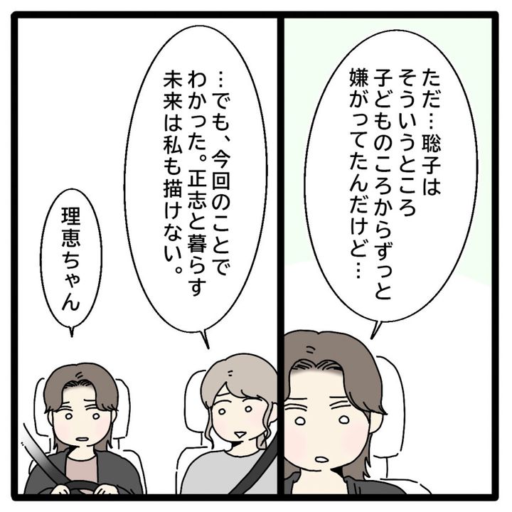 「ただ・・聡子はそういうところ子どものころからずっと嫌がってたんだけど・・」と、聡子さん本人は多田家というだけで特別扱いされることをよく思っていなかったとも話してくれました。「・・でも、今回のことでわかった。正志と暮らす未来は私も描けない」私は、同窓会以降の正志のこれまでの態度や、多田家や聡子さんを何よりも優先する正志とはもうやっていけないと感じていました。正志が私との離婚を選んだように、私も正志とこのまま一緒にいたいという気持ちはもうありませんでした。美沙ちゃんは、そんな私の想いを複雑そうな顔で静かに聞いていました。